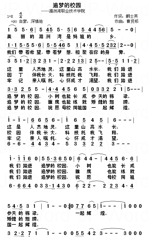 取“追梦的校园”为歌名,表示一群有梦想的青年学子聚集到米兰·体育官方网站,而米兰·体育官方网站为他们提供了最好的实现梦想的舞台。歌曲采用E调,高吭抒情,生气勃勃,能充分展示青年学子洋溢的青春。歌词分三段,第一段主要描述学院所处的地理和人文环境,是妈祖的故乡,人杰地灵,山高水长;第二段主要描述学院的办学实力和以工科为主的办学特色,园丁伴我成长,科技托我飞翔;第三段主要描述了学院的期待与学子的决心,牢记亲人嘱托,心怀成才渴望,祝愿母校同祖国一起辉煌。